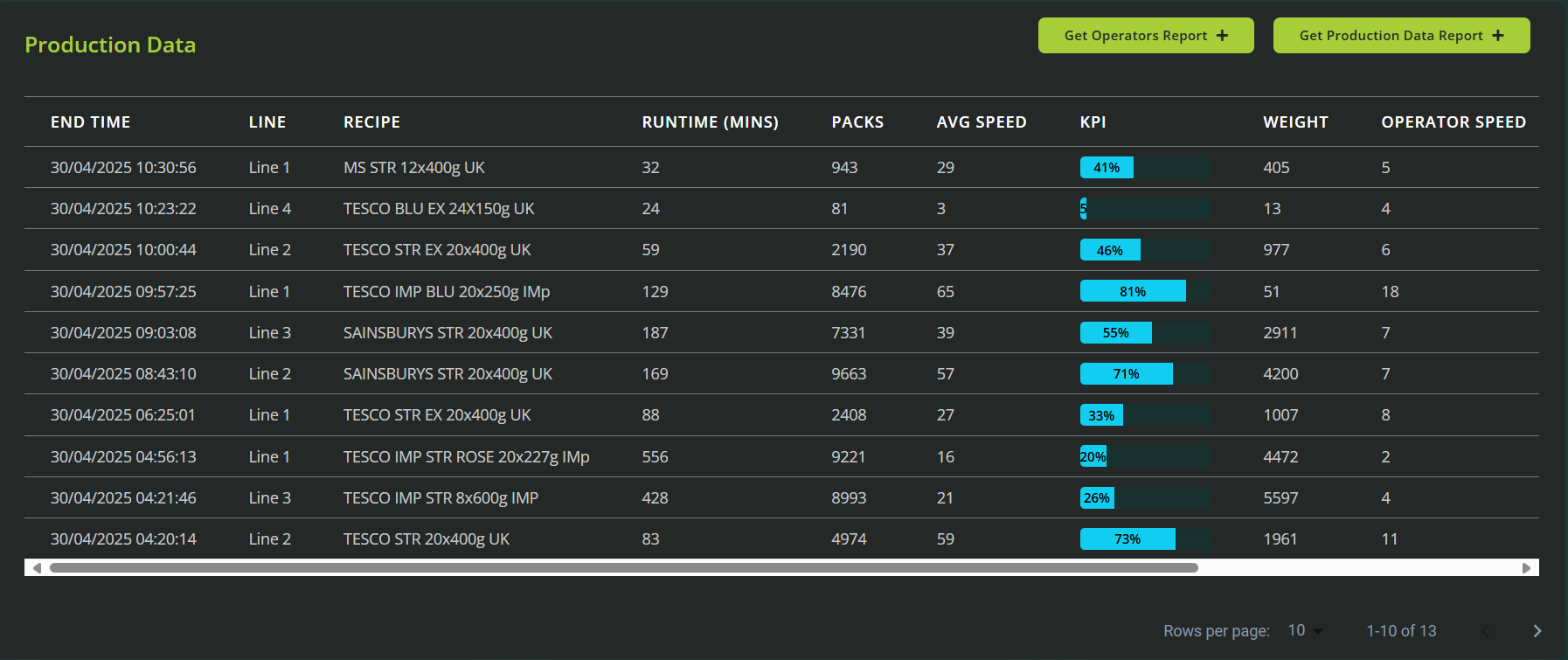 Provides comprehensive details of individual batches, including timestamps, production quantities, and giveaway details. Users can export these data sets into customizable reports for further analysis or archiving.