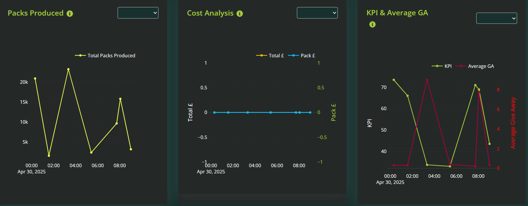 Packs Produced: Visual trends indicating production volumes over specified time periods.