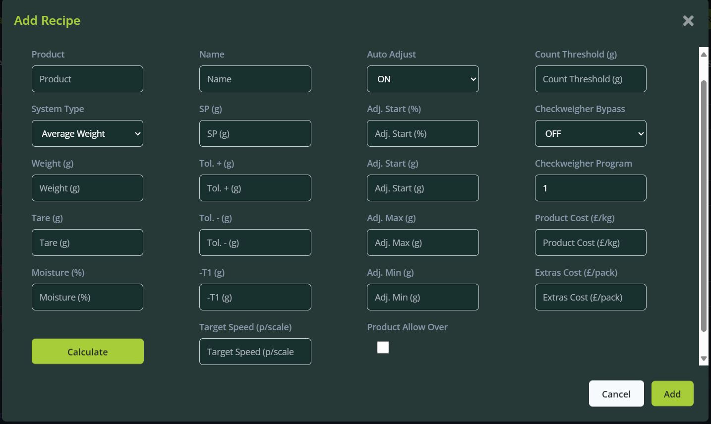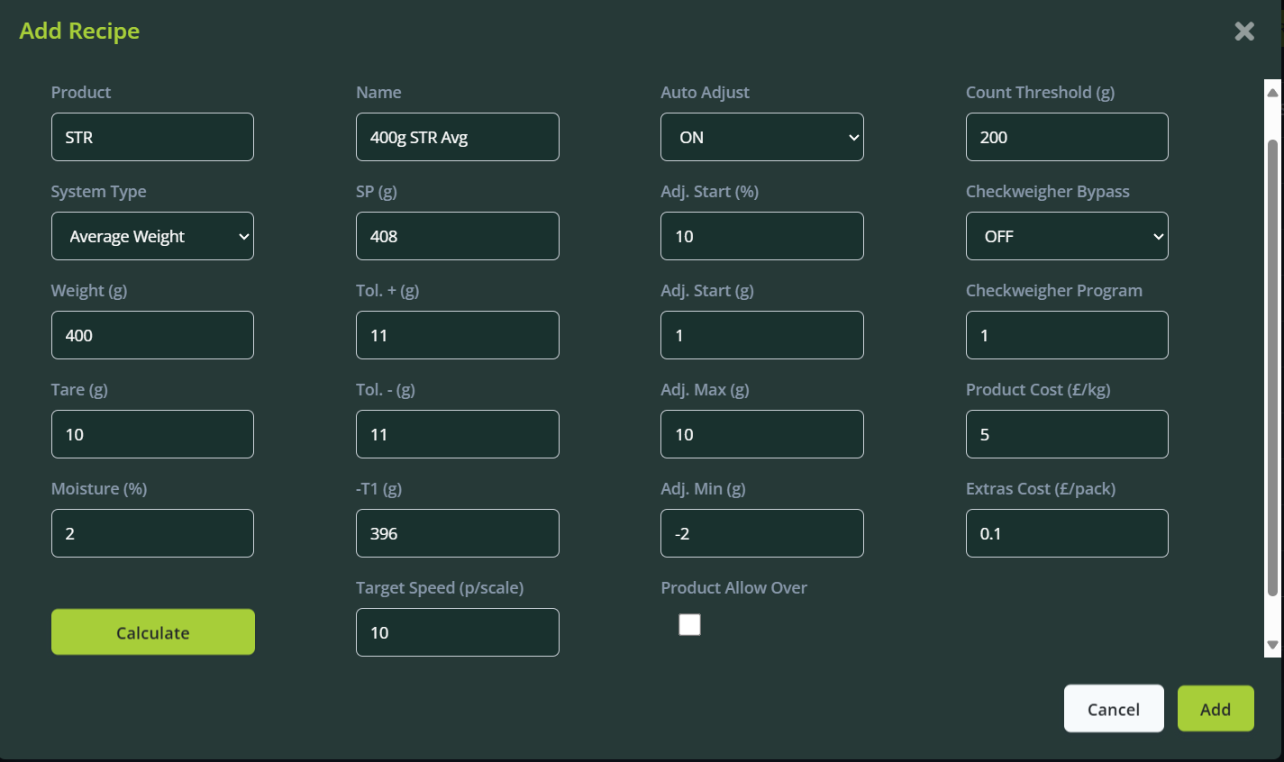 Click "Calculate" to automatically fill additional recipe parameters. Fields can be manually adjusted if necessary. Hover over field names for explanations of their functions.