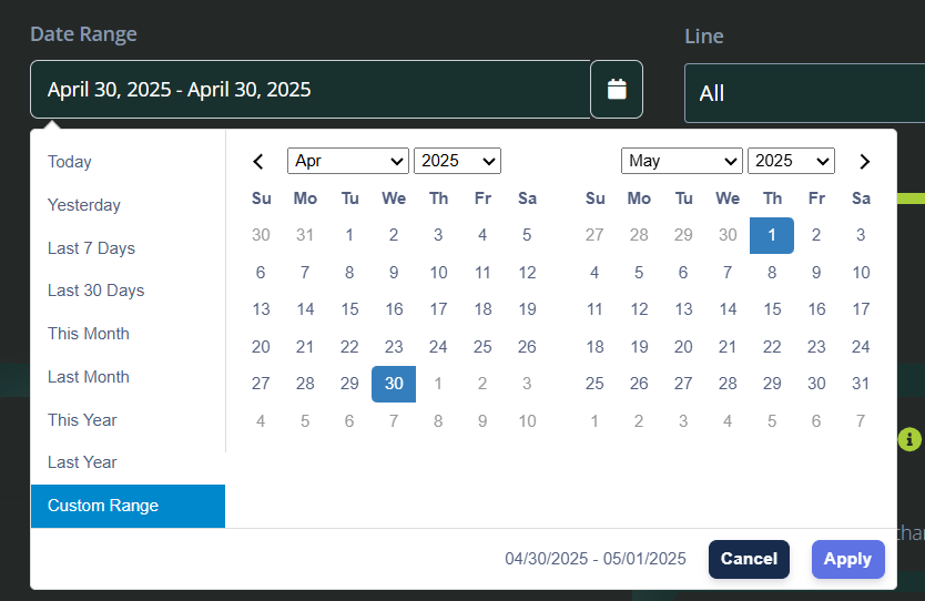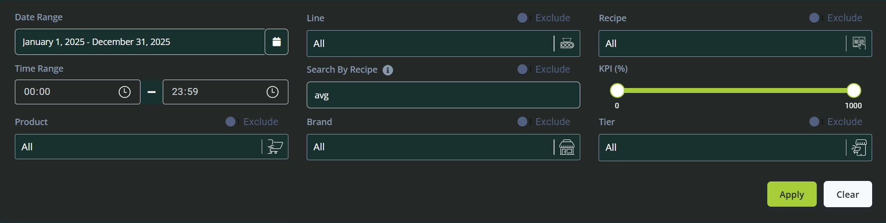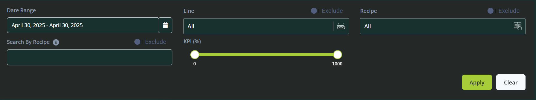 Lets you filter data by one or more production lines. This is useful for reviewing specific equipment performance, comparing lines, or excluding lines that were inactive or under maintenance.