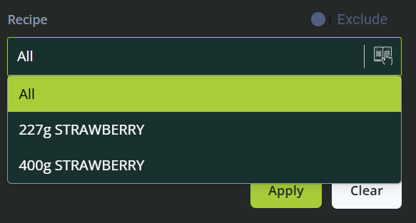 Once you've entered your search term, click "Apply" to filter the dataset. Only batches tied to the searched recipe will be displayed after applying the filter.