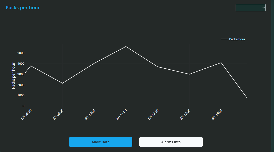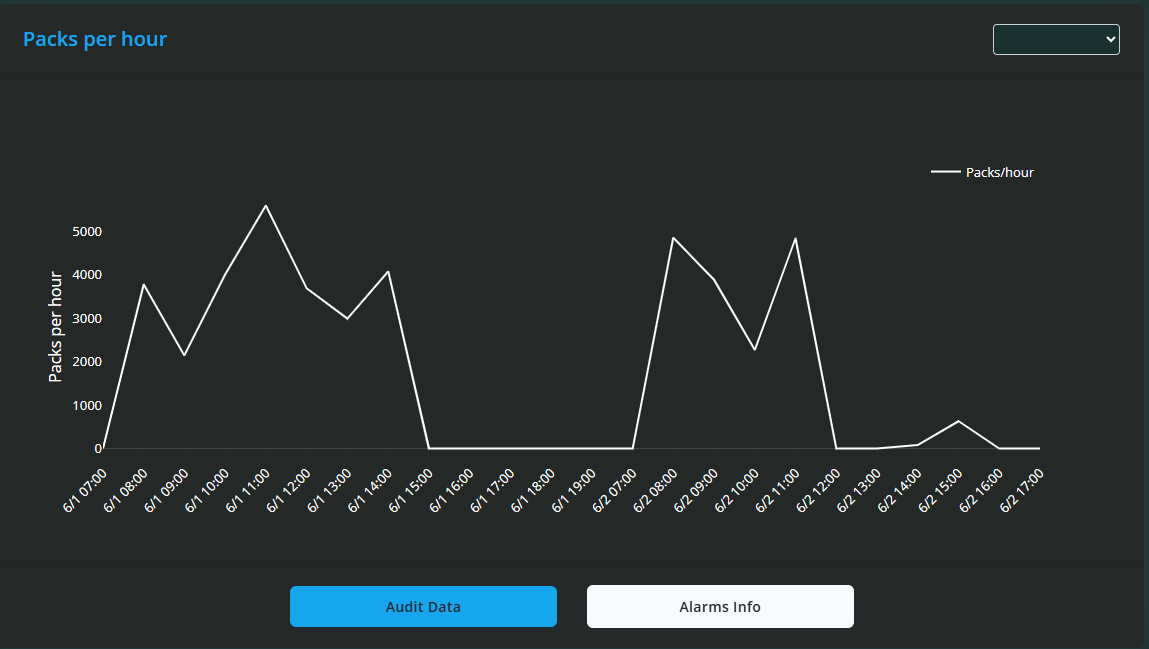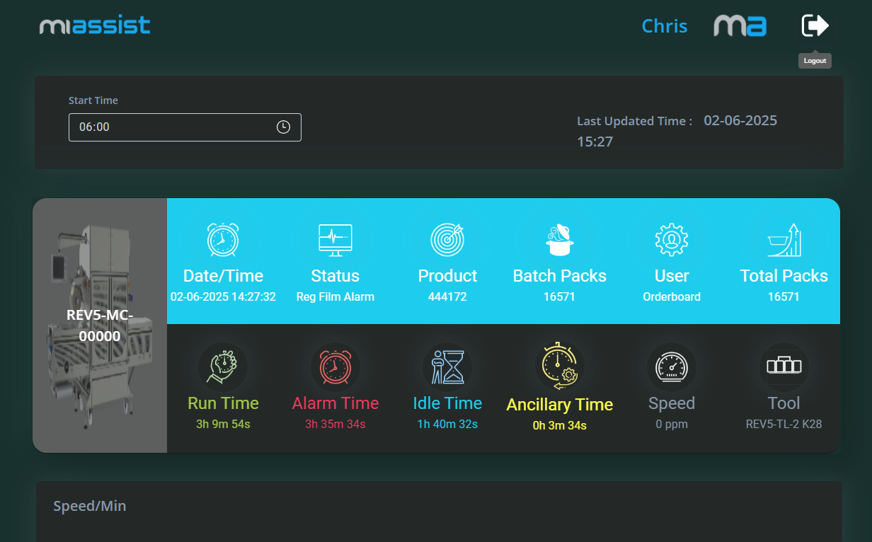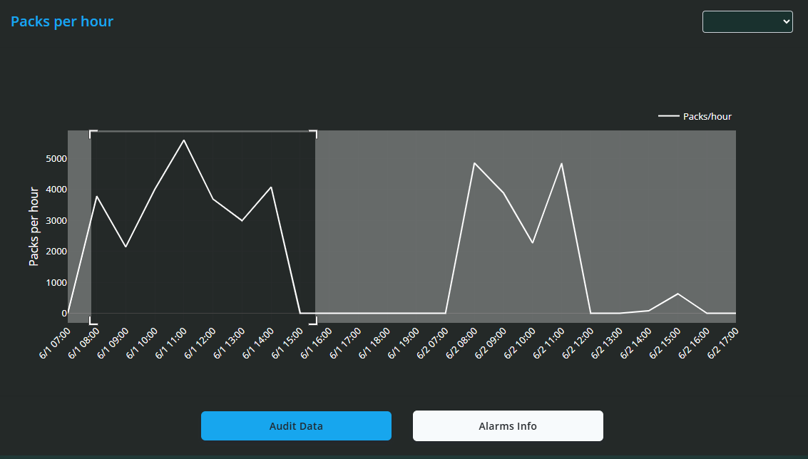 Beneath the machines list, an interactive speed line graph plots packs per minute over time, enabling you to zoom into periods of interest or revert to the full view with ease. This graph aids in recognising speed fluctuations that may indicate mechanical or operational concerns.