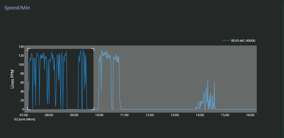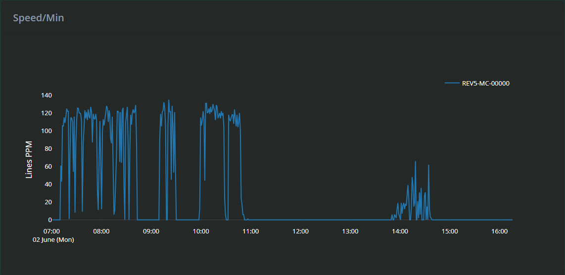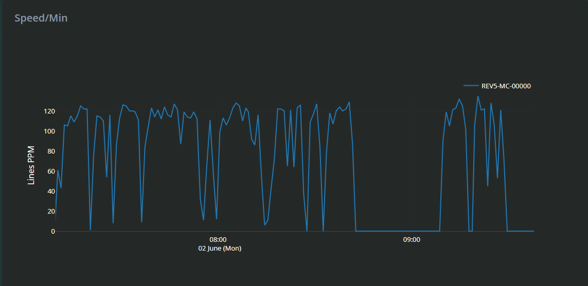 The graph plots Lines Per Minute (PPM) on the vertical axis against time on the horizontal axis, giving a visual overview of how the machine’s speed changes over the selected timeframe.
