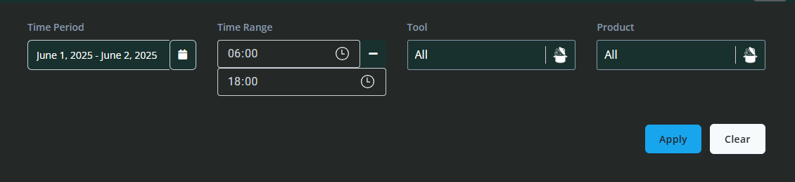 Filters give you control over the scope of data viewed, enabling targeted analysis for specific shifts, tools, products, or timeframes. This can help identify patterns or issues related to particular conditions or products.