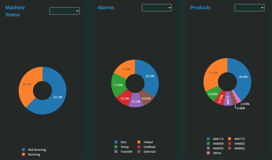 Pie Charts: Show the distribution of machine status, alarms, and products within the selected timeframe.