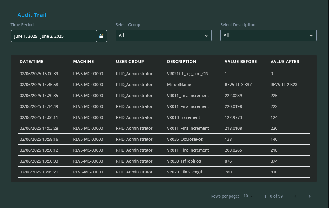 Audit Data: Clicking this displays a detailed log of all changes made to the machine. Each log entry includes the date/time, machine, user group responsible, a description of the change, and the values before and after the modification.