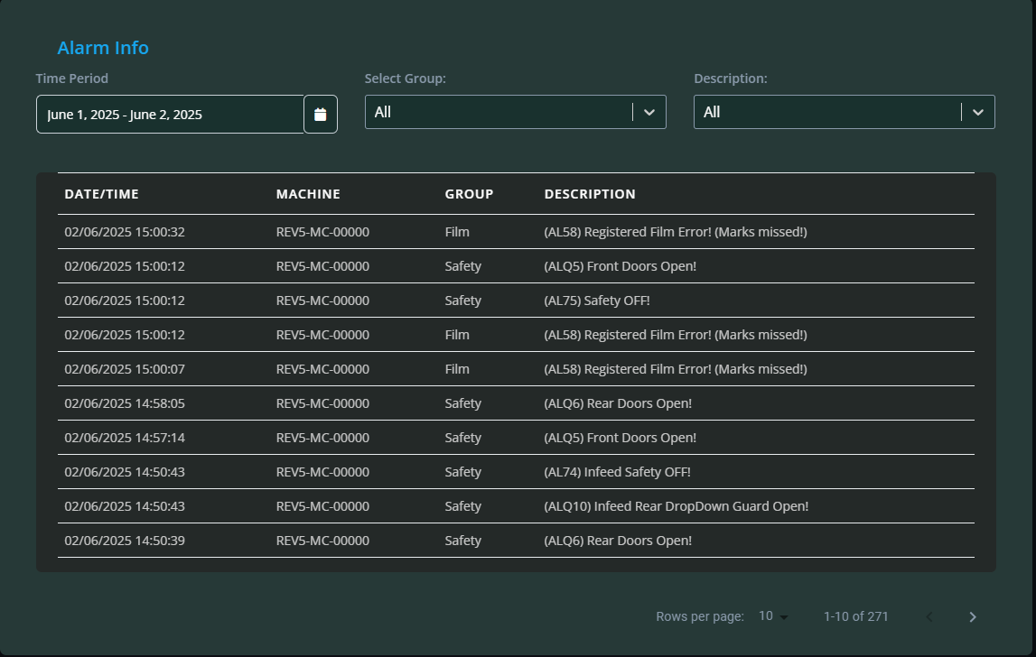 Alarms Info: Clicking this shows a log of all alarms that have occurred for the machine, with details including date/time, machine, group, and description of each alarm.